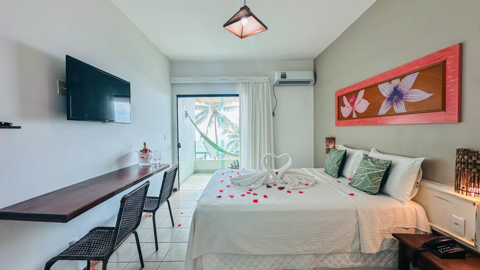 Suítes aconchegantes e bem equipadas, preparadas para proporcionar descanso e uma experiência agradável.